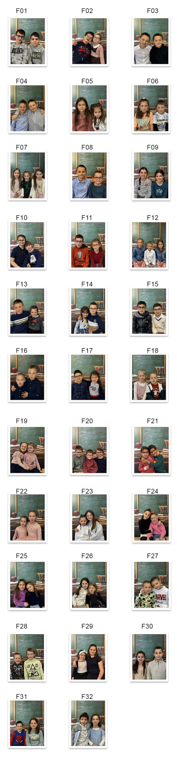 Photos de fratries au format 13×18. Merci de noter la référence de la photo de votre enfant sur le bon à remettre aux maîtres/maîtresses accompagné de votre règlement. (Attention, vous ne pouvez commander que la photo de votre enfant).